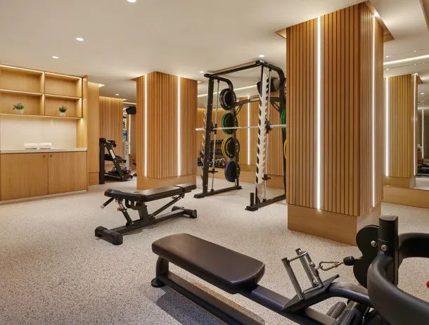 The hotel facilities include a gym equipped with cardio and weight training machines, as well as complimentary fitness equipment, water, and towels.